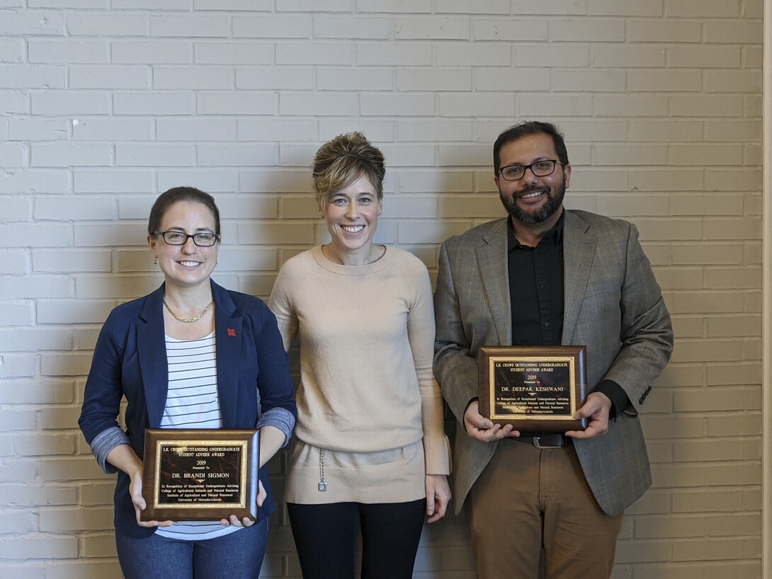 Lincoln, Neb. — Deepak Keshwani, associate professor of practice in the Department of Biological Systems Engineering, and Brandi Sigmon, associate professor of practice in the Department of Plant Pathology, received the Lawrence K. Crowe Outstanding Undergraduate Advising Award on Nov. 15. This award recognizes faculty members who have made outstanding contributions in undergraduate advising.